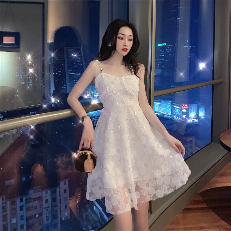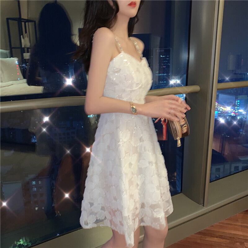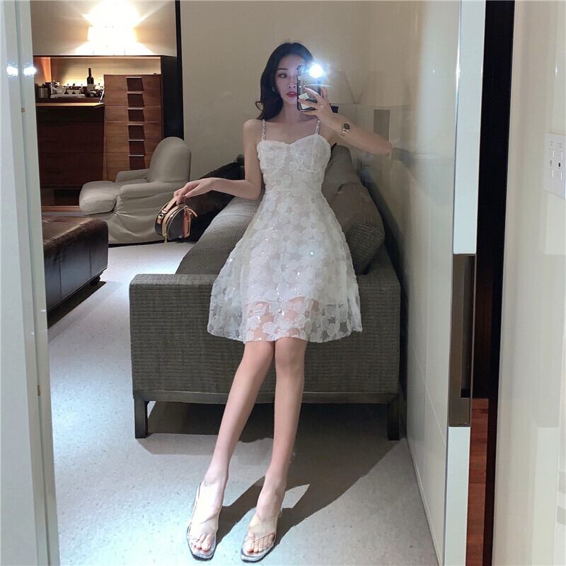 動くたびにキラキラと光って見える花が可愛いミニドレス。
