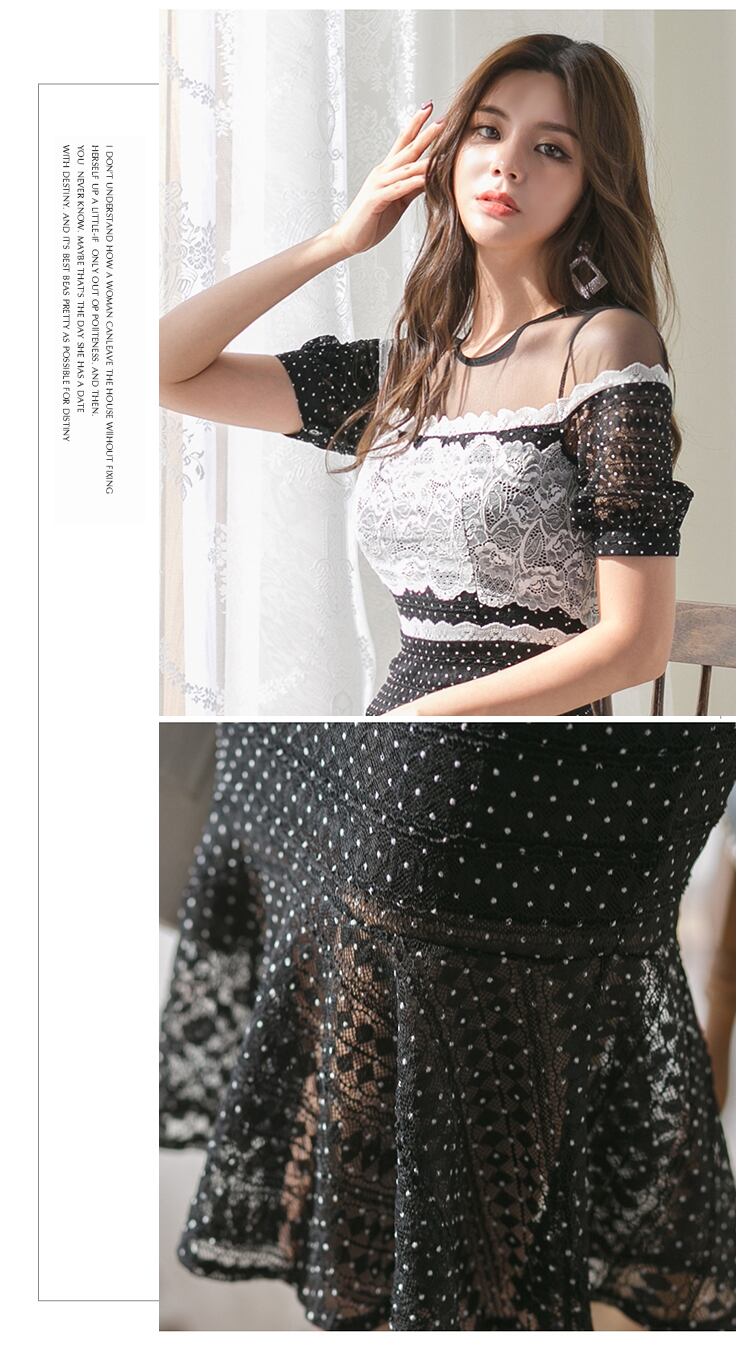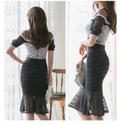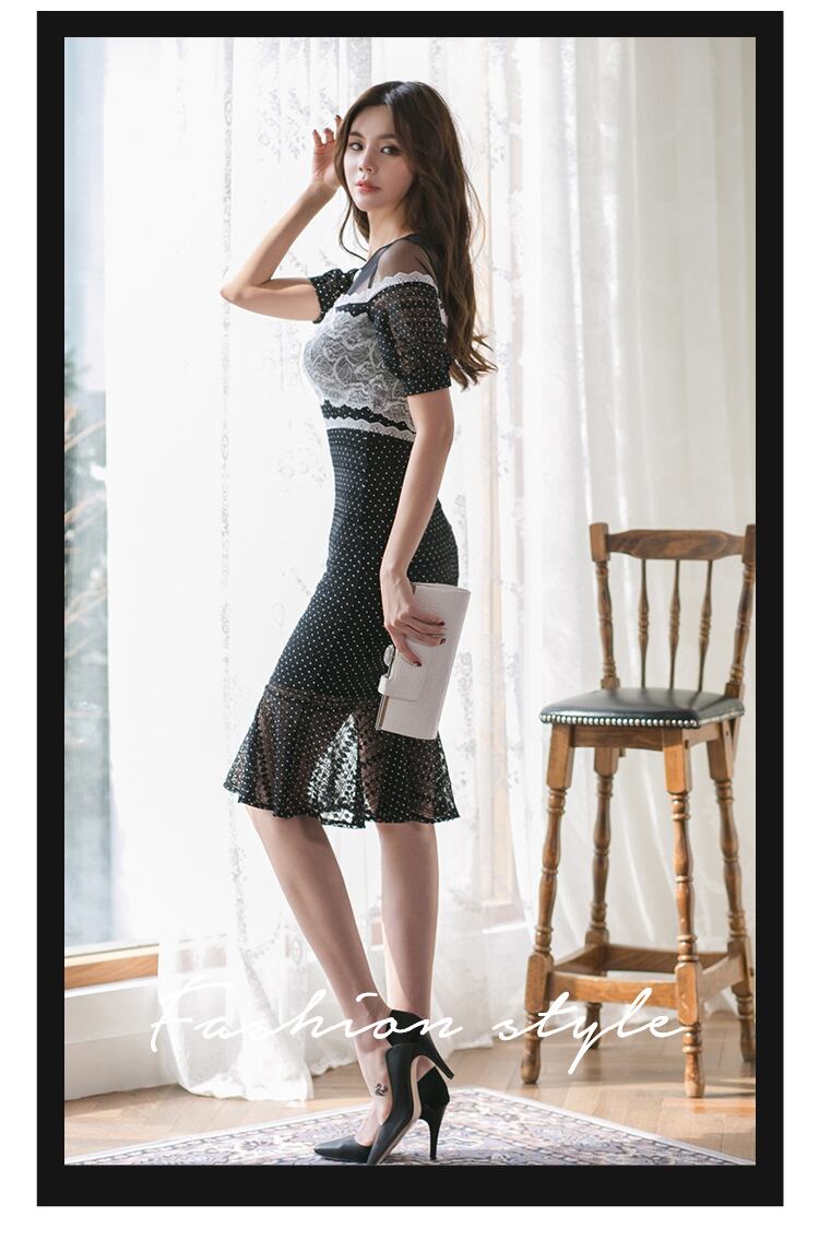 フラワーレースとドット柄の大人可愛いマーメイドラインの美ワンピ。