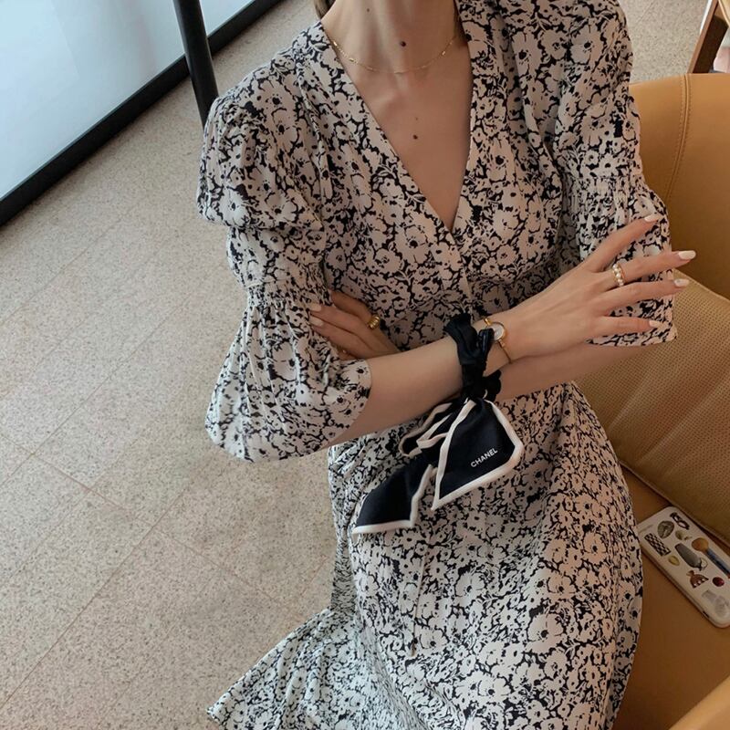 スキッパー 深V 花柄 ドレス ワンピース ロングドレス ワンピースドレス カジュアルドレス セクシードレス 膝下 ロング ロング丈 七分袖 ボリューム袖 パフスリーブ ホルンスリーブ Vネック 襟なし スリム フレア シフォン ウエストリボン 胸元 谷間 かわいい 大人可愛い きれいめ カジュアル 大人 上品 おしゃれ レトロ 大人女子 こなれ感 キュート セクシー 存在感 とろみ感 華やか 清楚 個性的 柄 花柄 20代 30代 40代 レディース 女性用 デート お出かけ 女子会 春 夏 お呼ばれ | Come to Store
