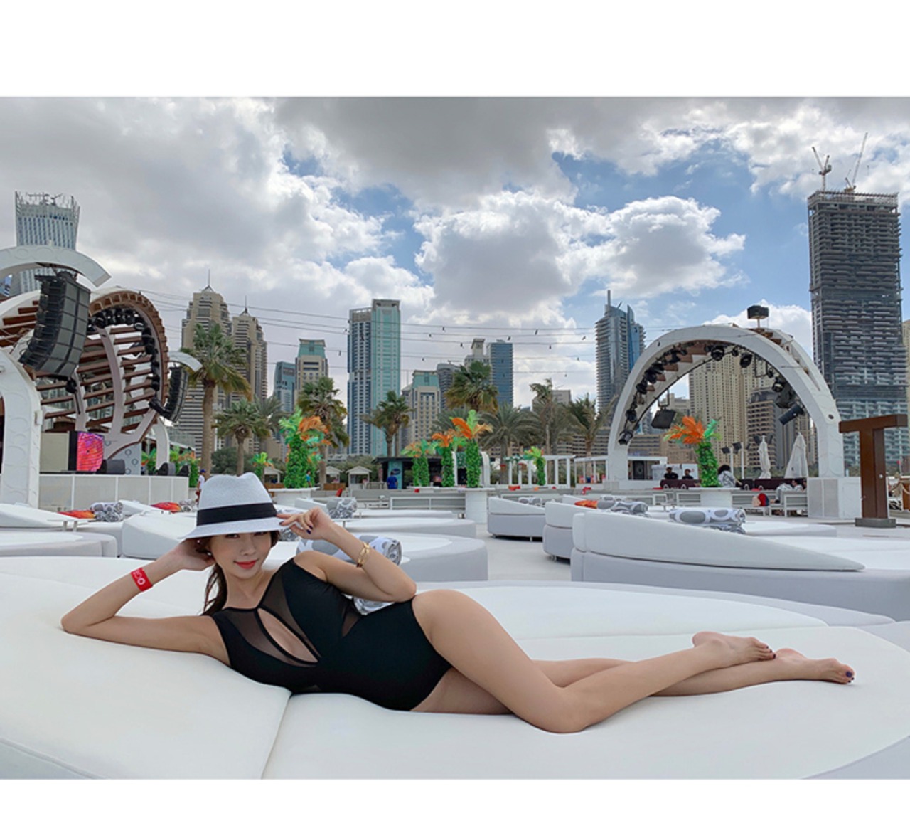 胸元と背中の大胆なカットがセクシーなワンピース水着。