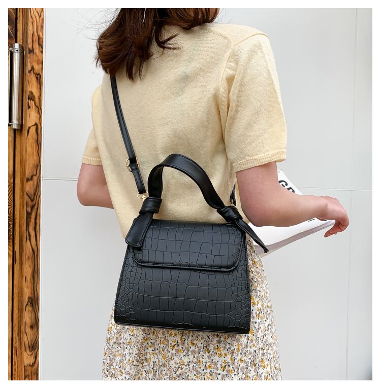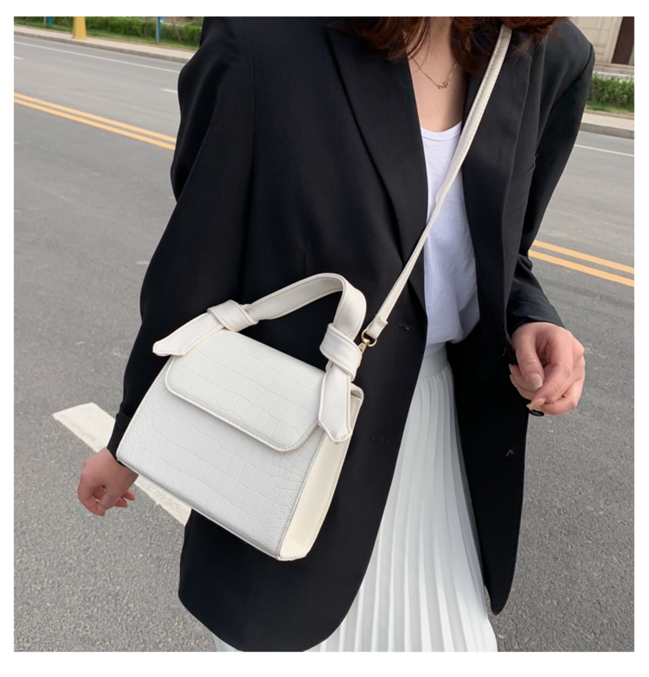 持ち手がリボン風になっているのが洒落見えポイントのクロコ調型押しバッグ。