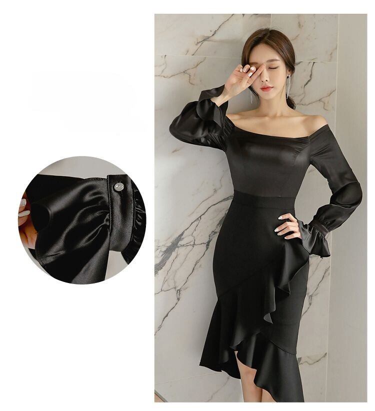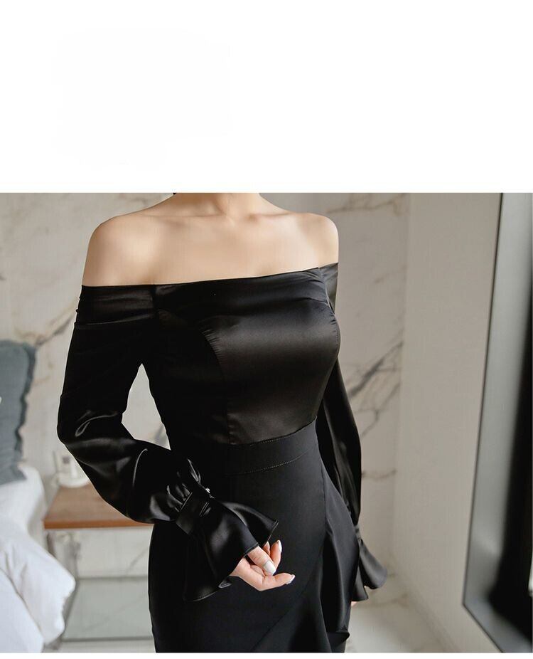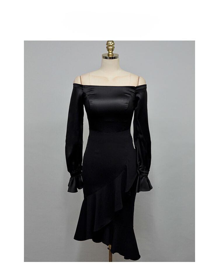 スレンダーで細見えなボディラインに、肩出しオフショル仕立てがセクシーに見せます。ミディアムひざ丈ワンピースです。 ゴージャスで、ハイウエスト足長効果UP。