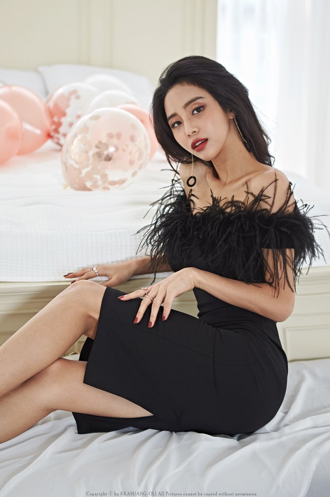 ふんわりとしたフェザー素材があしらわれたオフショルダーがおしゃれなアクセントに。