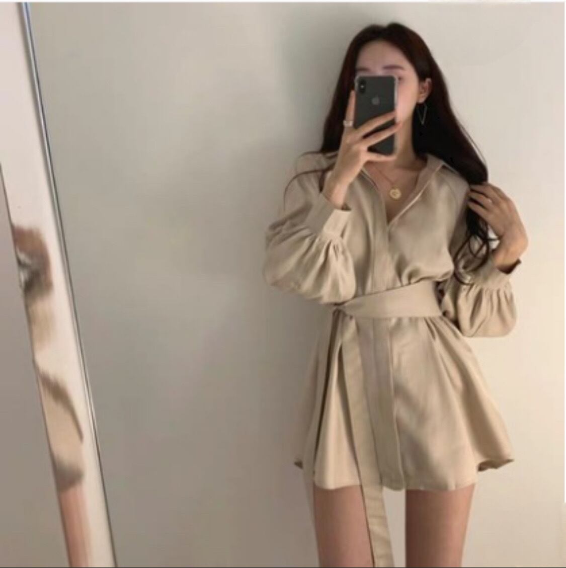 付属の共布ベルトでウエストをキュッと絞った着こなしがおススメです。