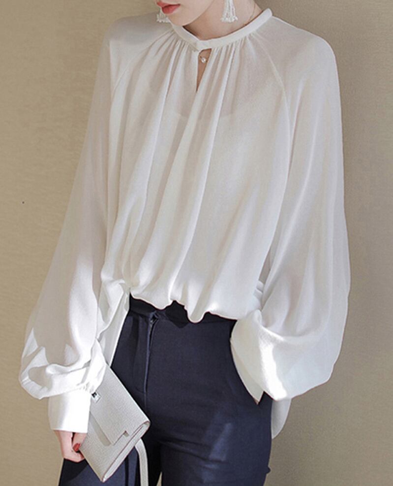 袖のボリュームと落ち感のある上品なシルエットが女性らしさを演出します。