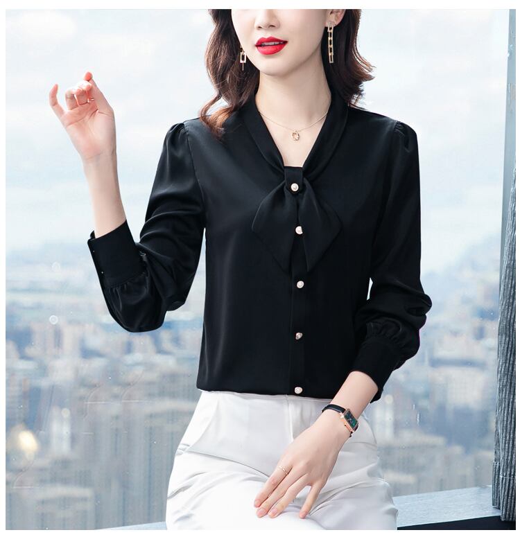 パンツにもスカートにも合わせやすく、オフィスカジュアルにもぴったり、きれいめボウタイブラウス。