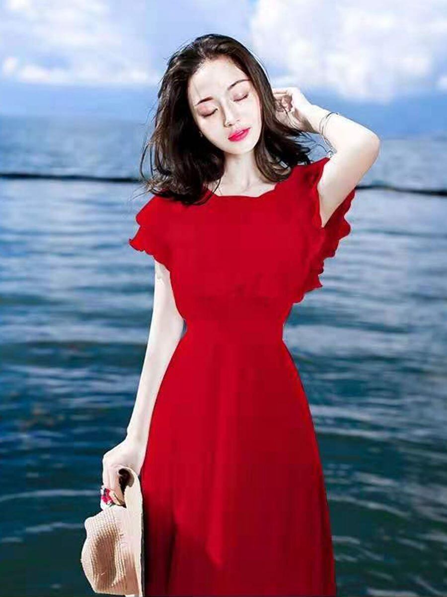 フリルスリーブと揺れるフレアシルエットが大人上品な印象に。