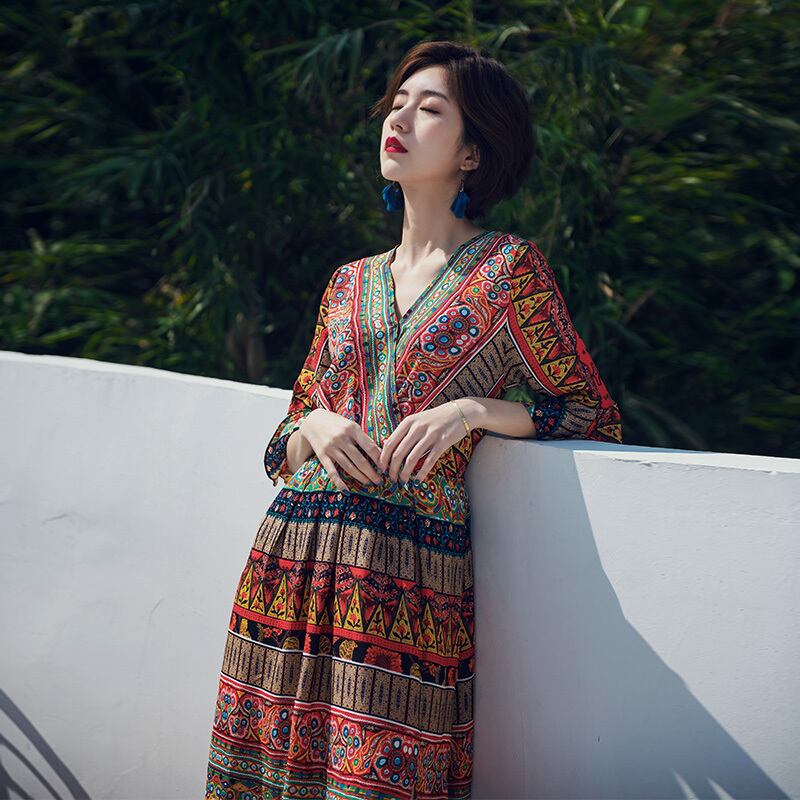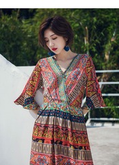 エキゾチックな印象のフレアワンピース。