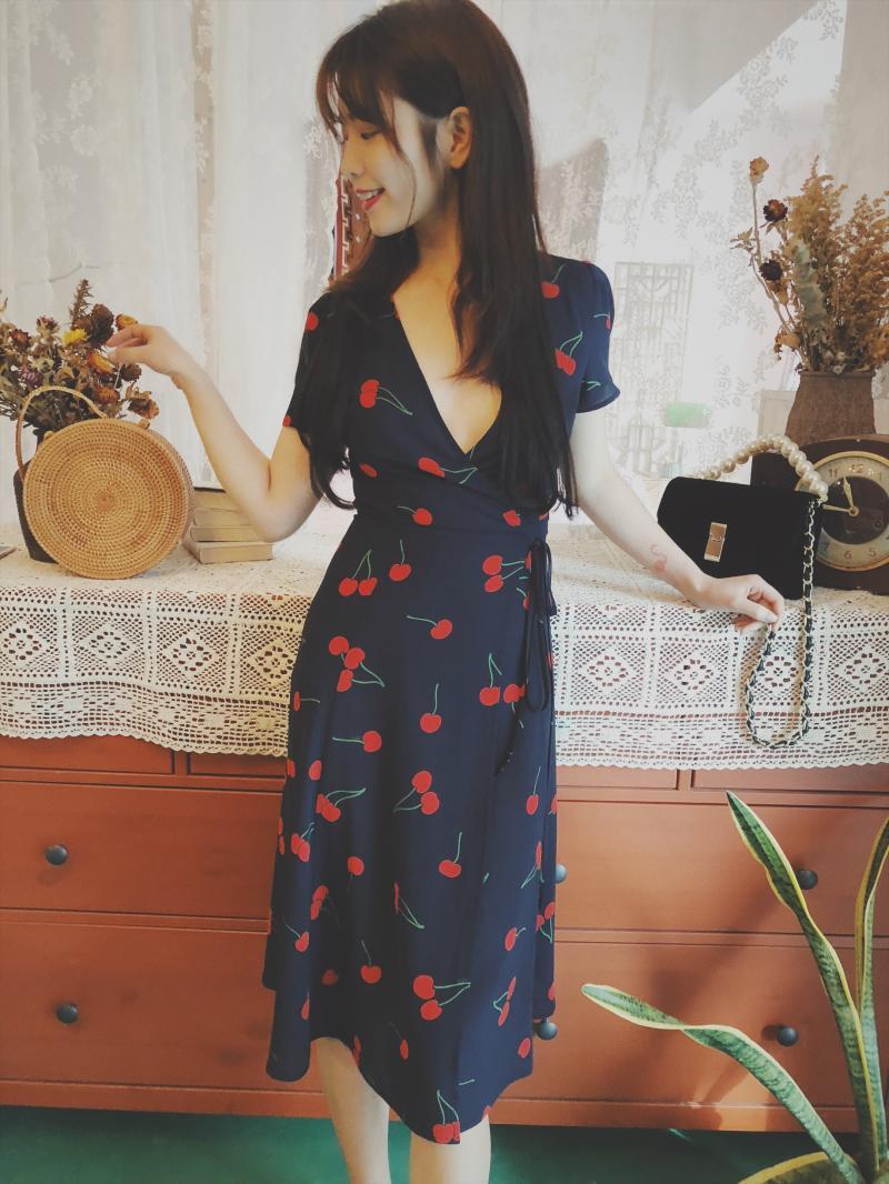 さくらんぼ柄が可愛らしい、半袖ワンピース。