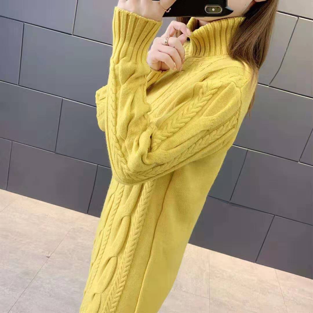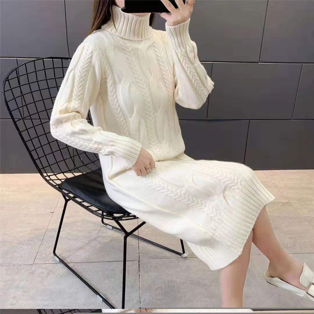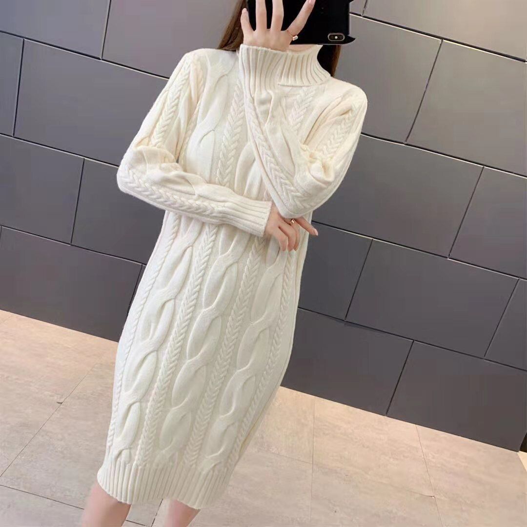 ぬくもり感あふれるケーブル柄のハイネックニットワンピース。