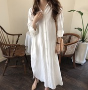 くすんだニュアンスカラーが上品な印象のシンプルなロング丈ワンピース。