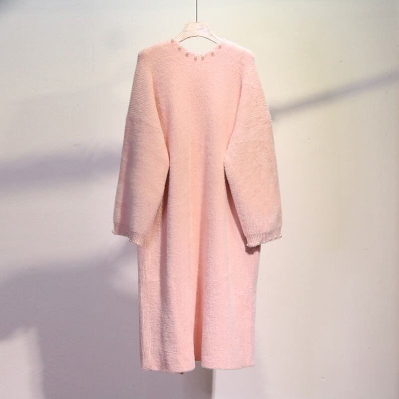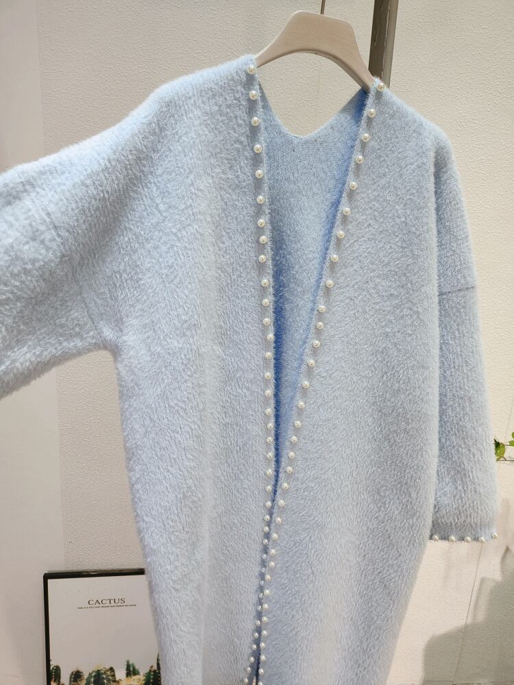 襟元や手首に、パールが付いた、大人可愛いロングカーディガン。