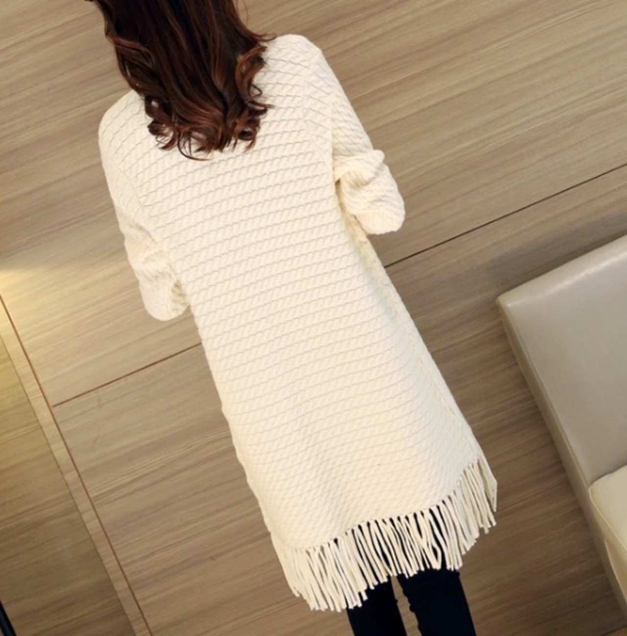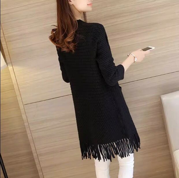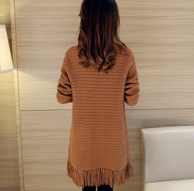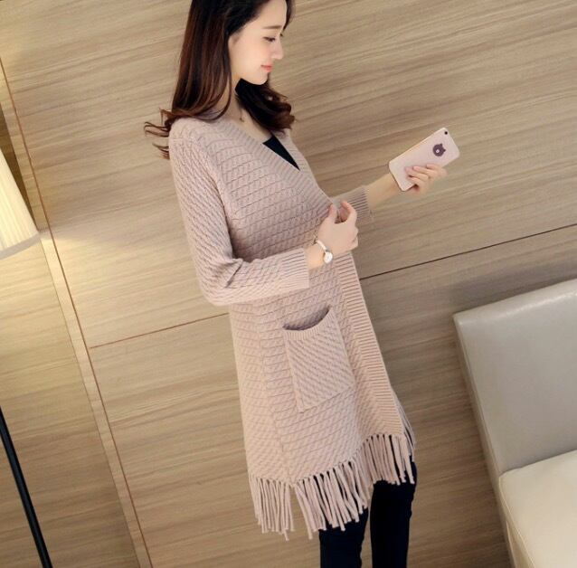 ケーブル編みと裾のタッセルがおしゃれなデザインのロングカーディガンです。
