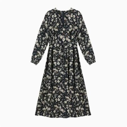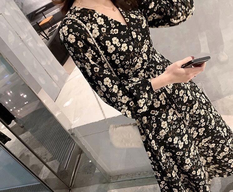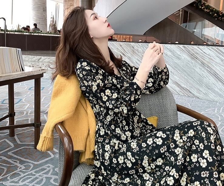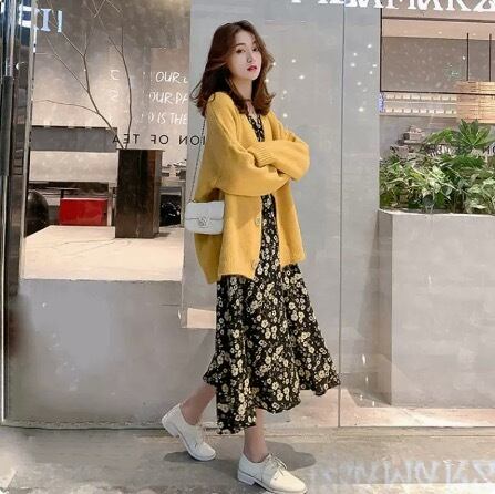 シックな花柄ワンピースと発色の良いイエローカラーカーディガンのセットです。