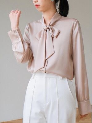 光沢のある素材がエレガントなリボン付きブラウスです。