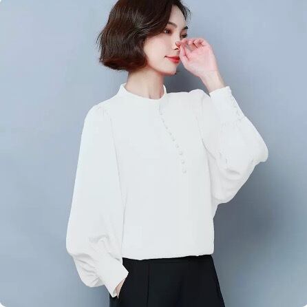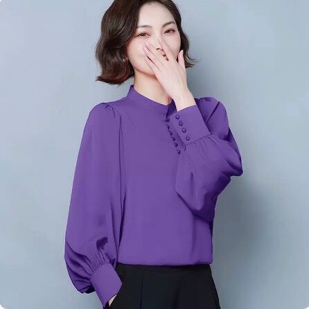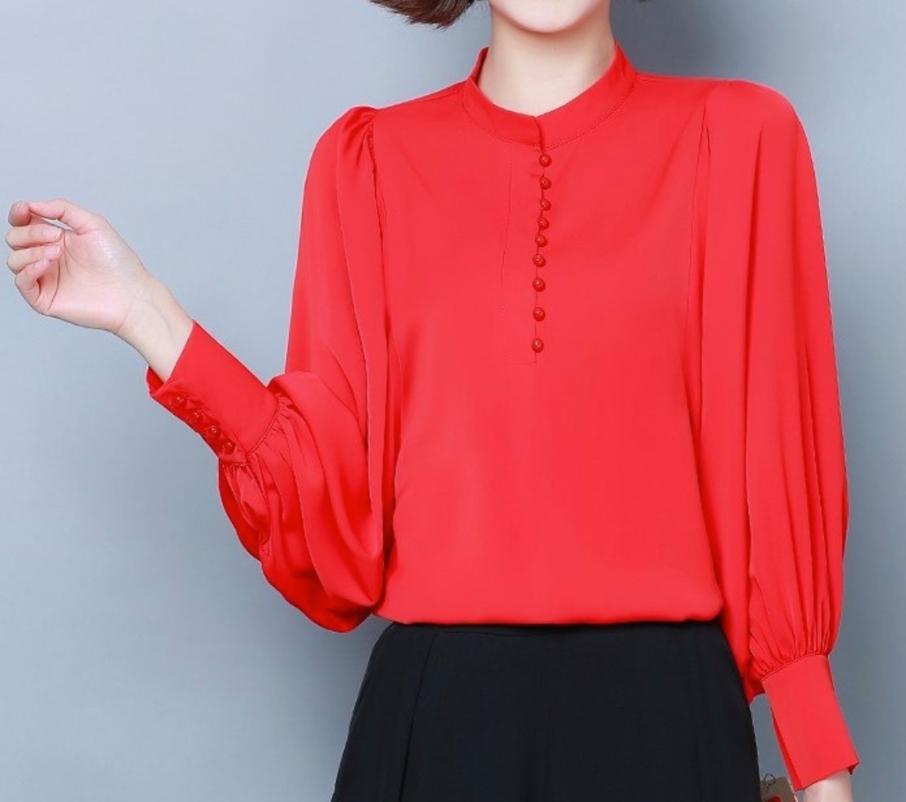 発色の良いカラーのスタンドカラーブラウスです。