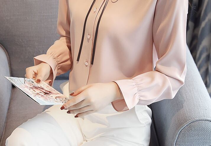 襟部分にリボンがあしらわれた、大人可愛いデザインのブラウス。