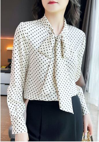 ボウタイデザインを取り入れたドット柄のブラウス。
