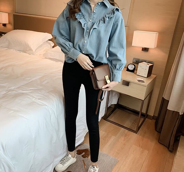 襟部分に、フリルのデザインがあしらわれた、デニムシャツ。