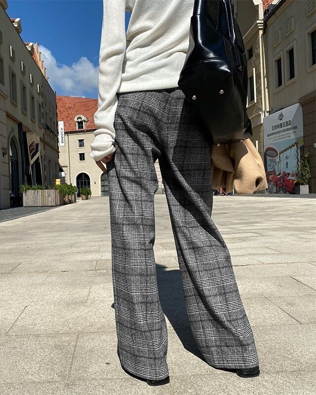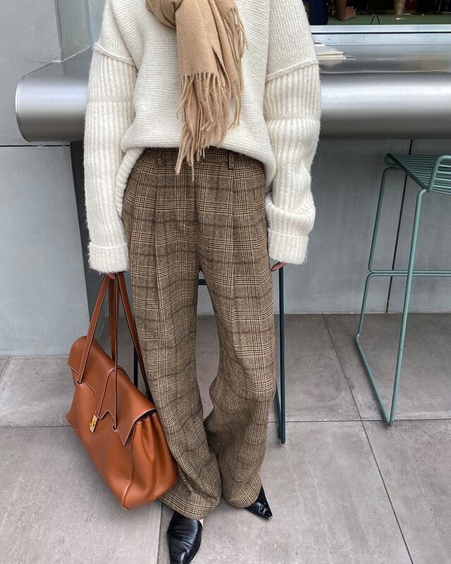 グレンチェックとゆったりとしたストレートシルエットが、コーディネートにトラッドなテイストをプラスします。