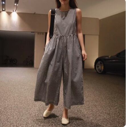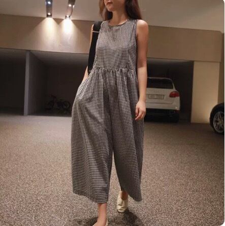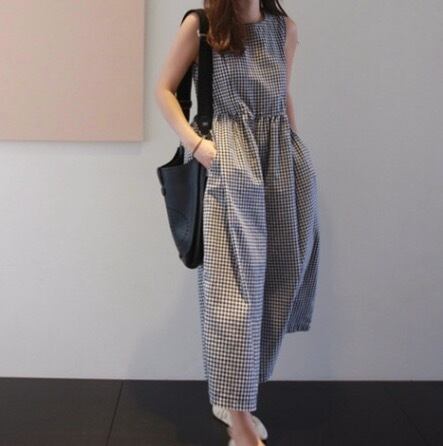 ギンガムチェックと無地のノースリーブオールインワンです。